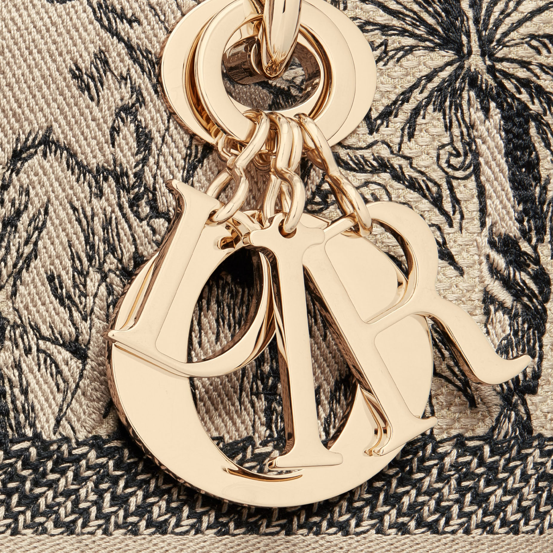 The Lady D-Lite bag embodies the House's vision of elegance and beauty. Refined and timeless, the creation is entirely embroidered with the beige multicolor Toile de Jouy Voyage motif by Pietro Ruffo, setting Mr. 's iconic pattern in the heart of Indian flora and fauna. Pale gold-finish metal D.I.O.R. charms embellish and illuminate the silhouette. Featuring a reversible and removable wide, embroidered shoulder strap, the medium Lady D-Lite bag can be carried by hand or worn crossbody.